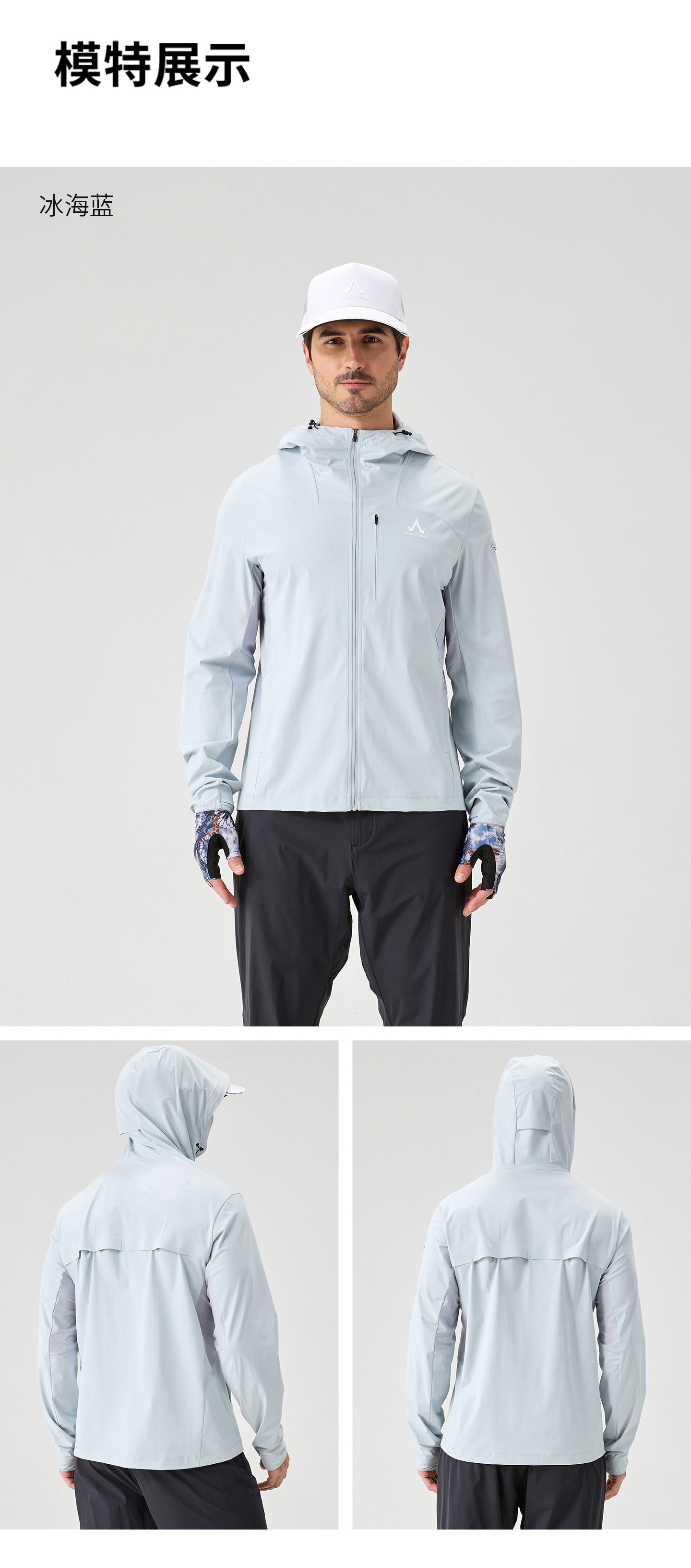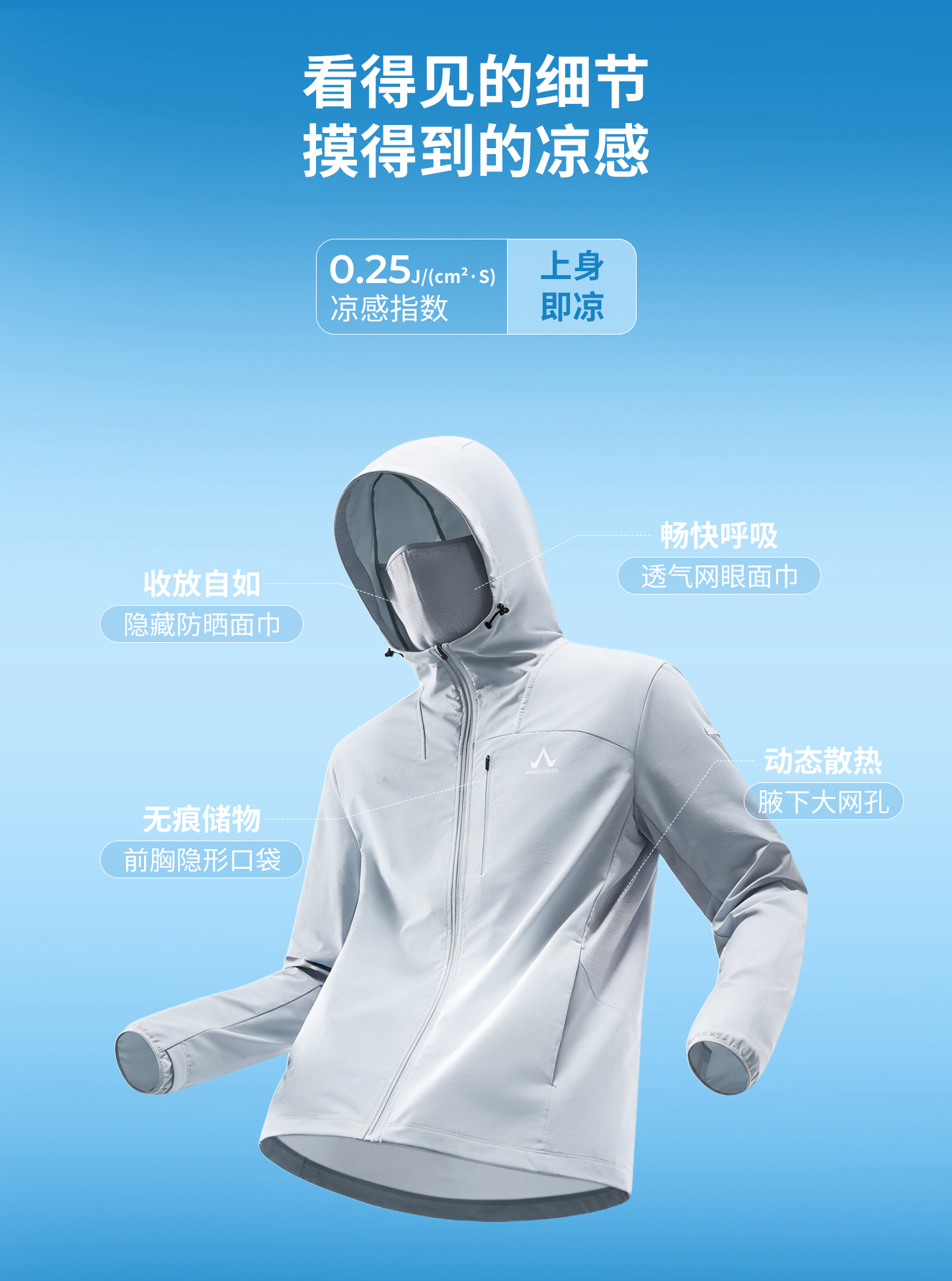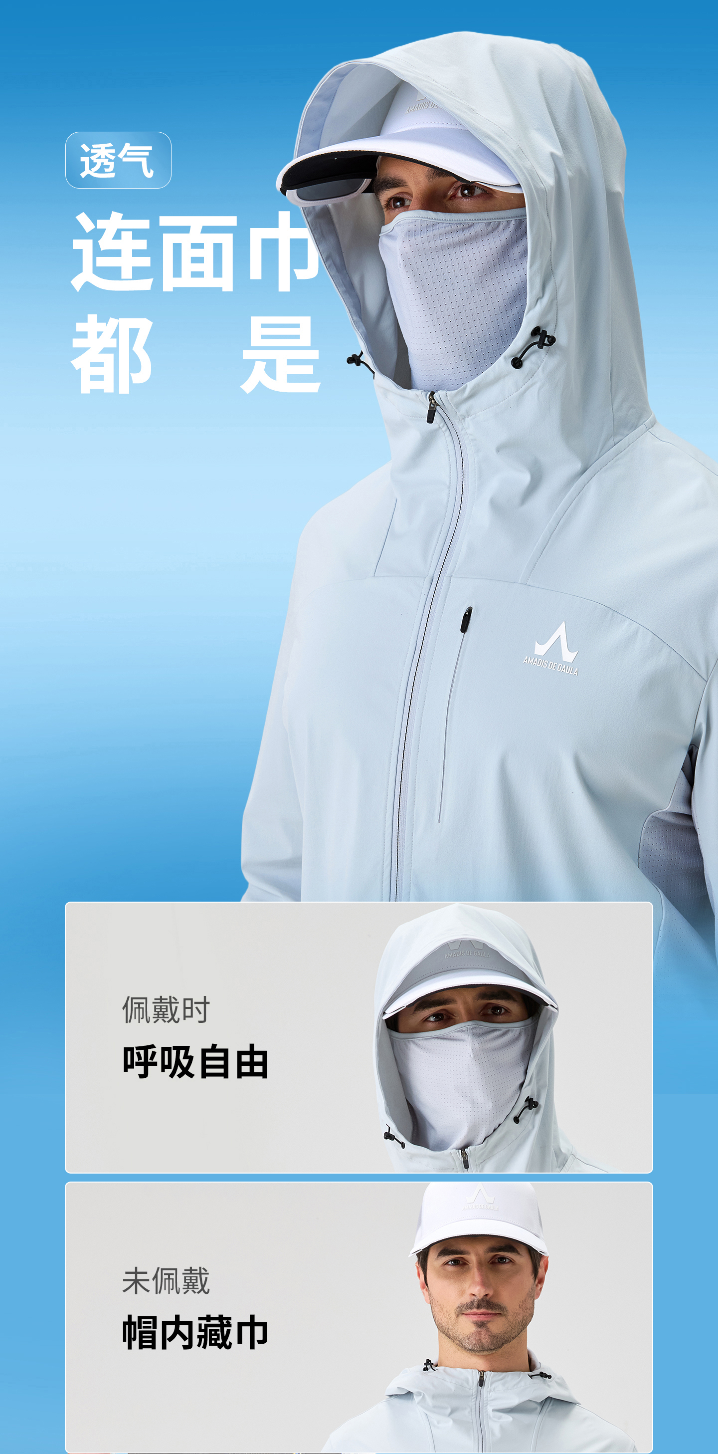 ·一体连帽设计,搭配隐藏面巾实现头颈面全面防晒