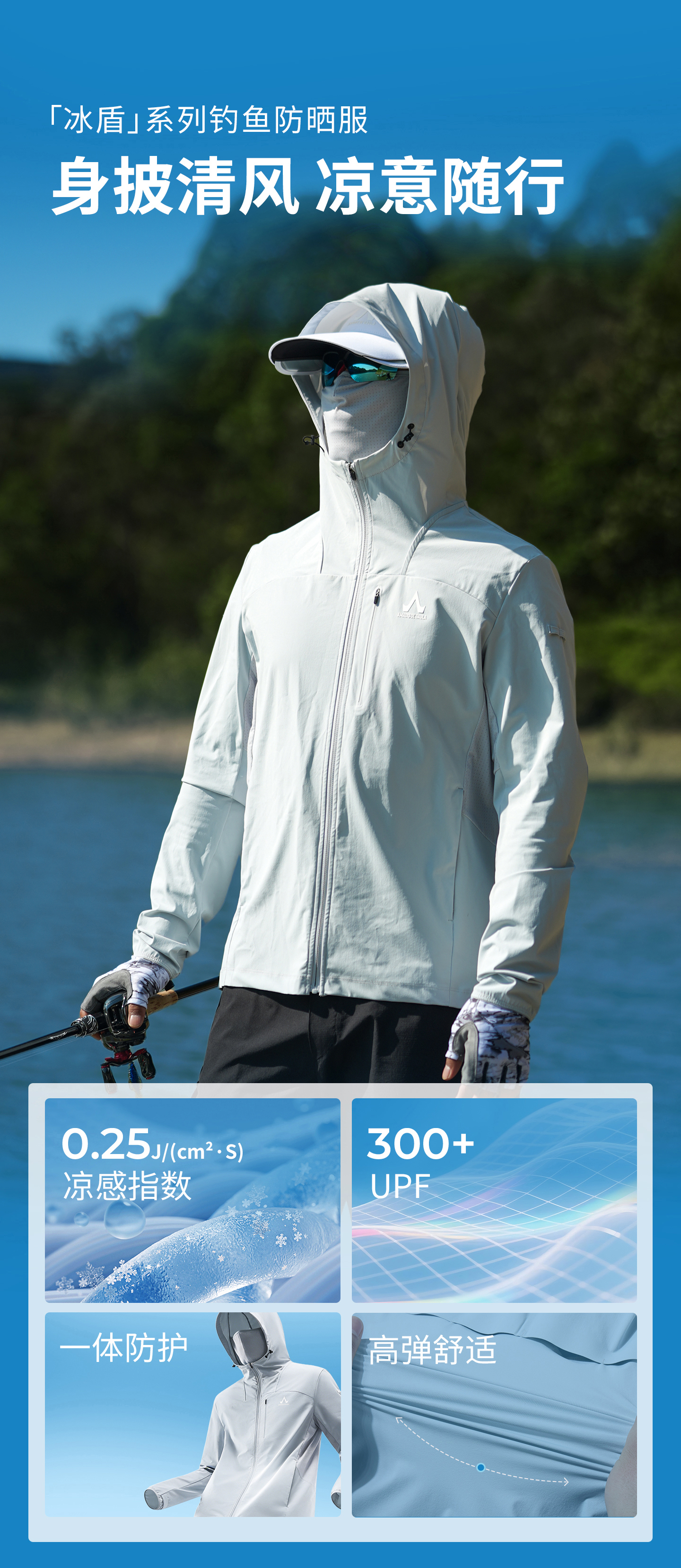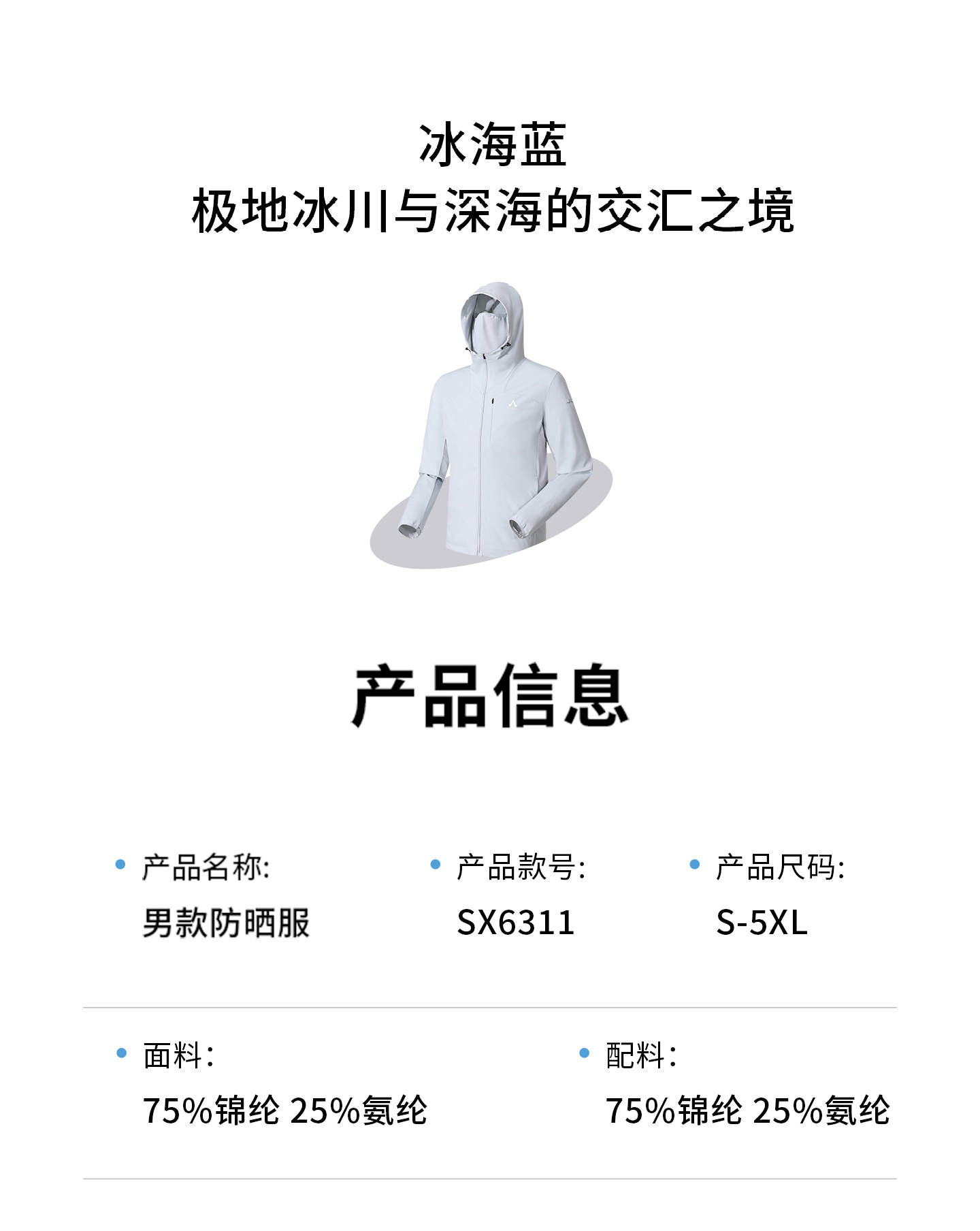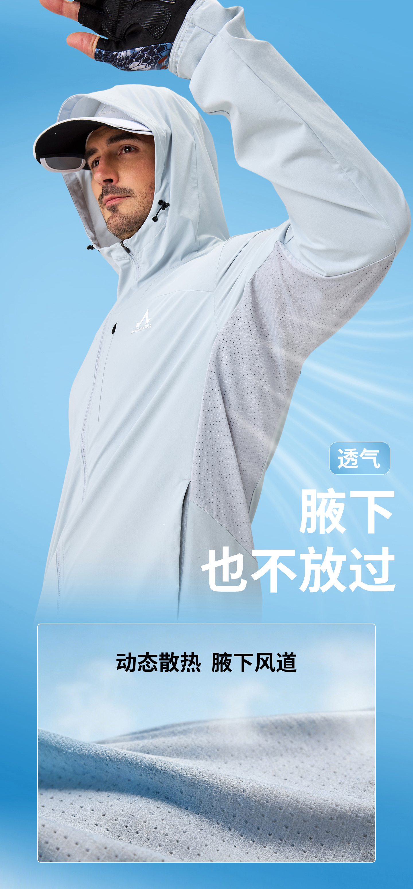 ·一体连帽设计,搭配隐藏面巾实现头颈面全面防晒